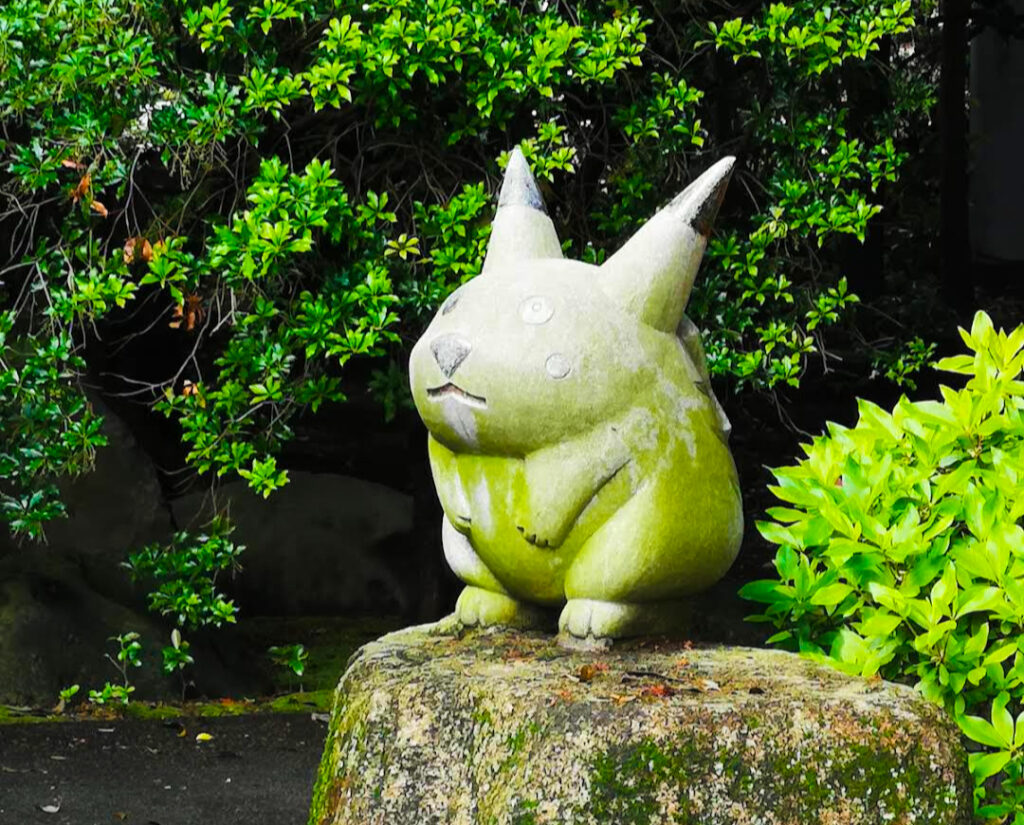 苔むした「ドラえもん」や「ピカチュウ」の石像たちです。