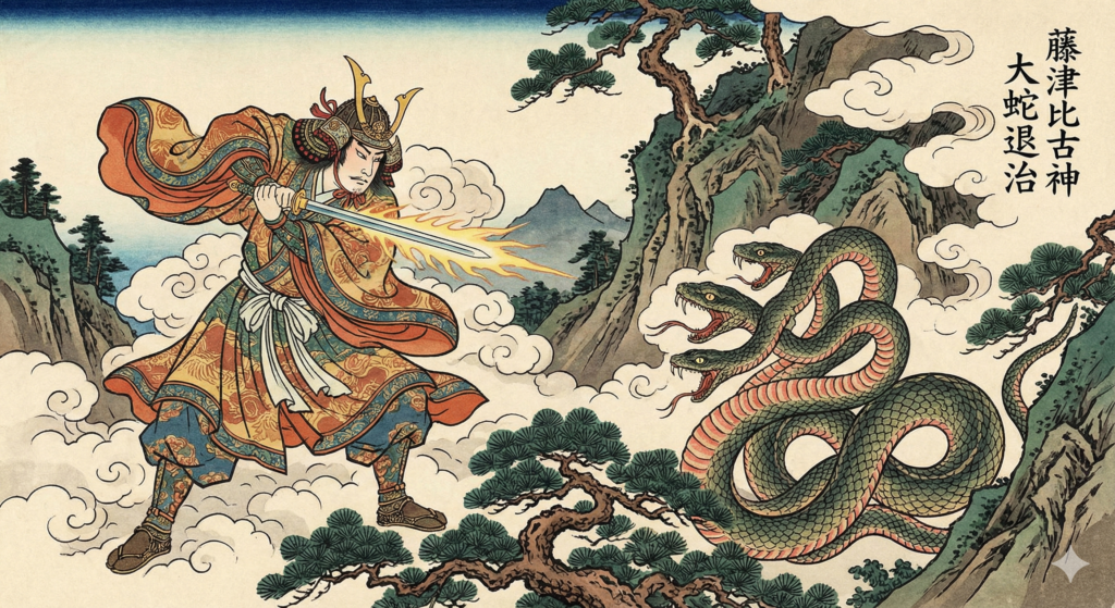 藤津比古神社の創建は、伝承によれば景行天皇の御宇(古墳時代前期頃)にまで遡ります。『延喜式神名帳』にも名を連ねる古社ですが、ここで最も注目すべきは、主祭神・藤津比古神(ふじつひこのかみ)にまつわる「大蛇退治」の英雄神話です。