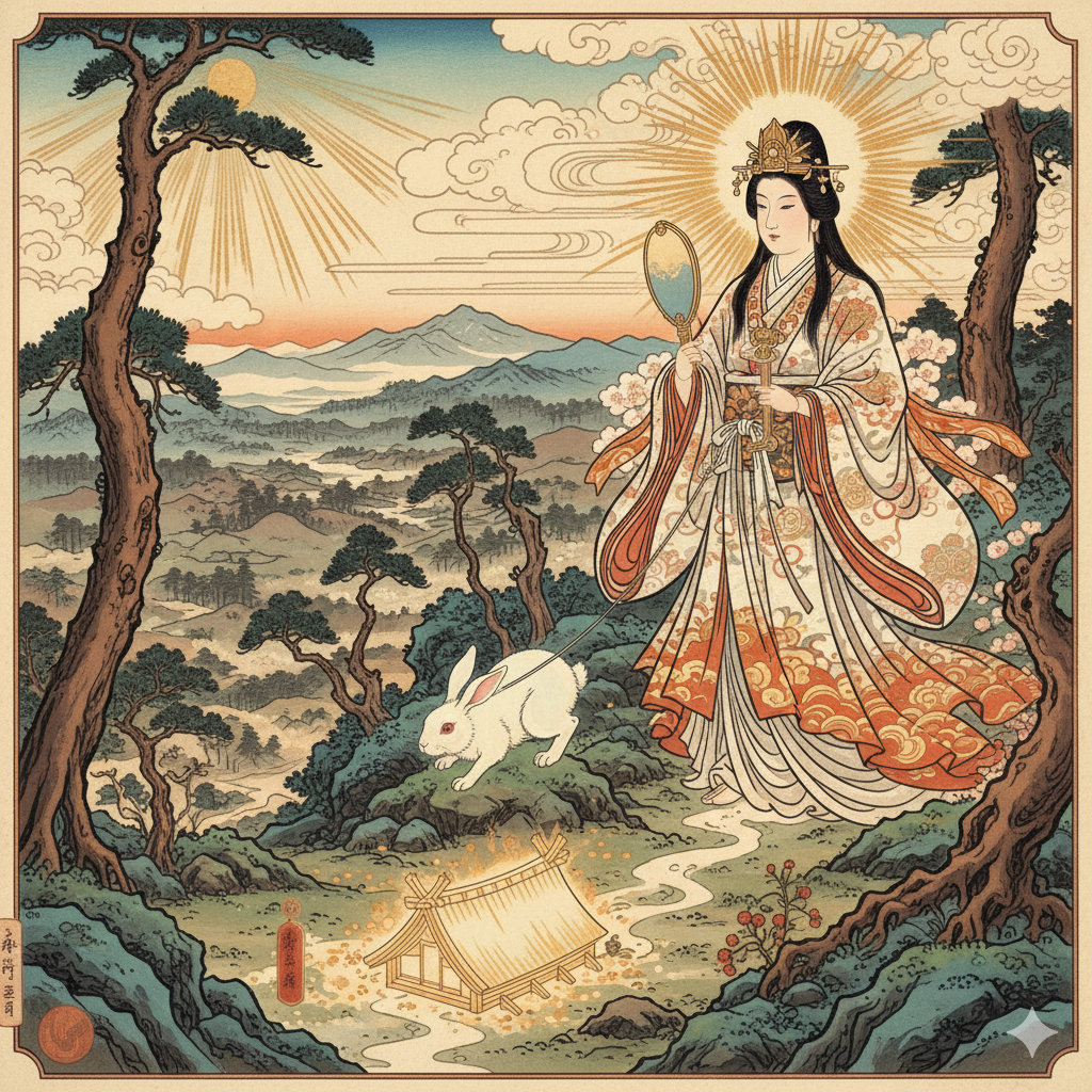 はるか神代の昔、太陽を司る女神・天照大神が、八頭の中山という山に降臨されました 。大神はこの地を仮の宮(行宮)と定めようと四方を見渡されます。その時、どこからともなく一羽の純白の兎が現れ、大神の装束の裾をそっと口にくわえ、先導するかのように歩き始めたのです 。