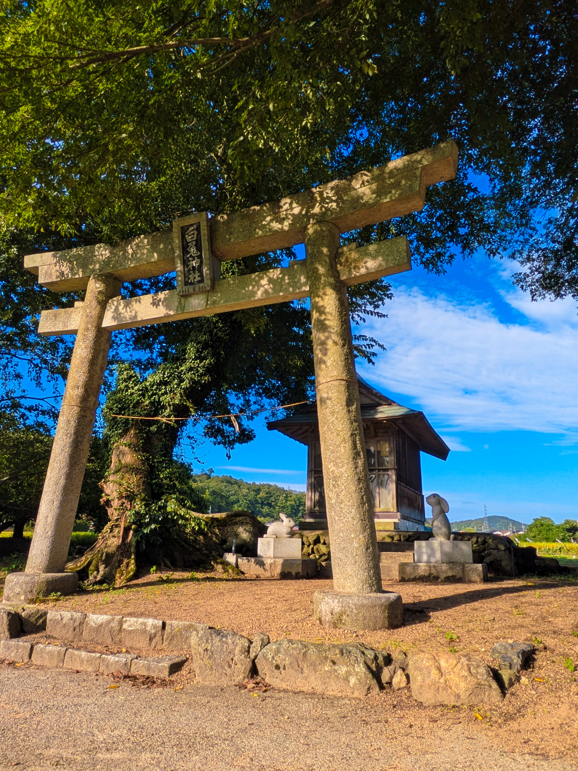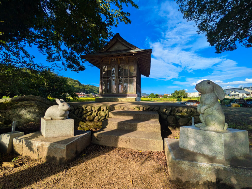まず訪れるべきは、住民の熱意によって再建された現在の福本白兎神社です。田園風景の中に静かに佇む境内では、一般的な狛犬ではなく、愛らしい一対の兎の石像が参拝者を迎えてくれます 。