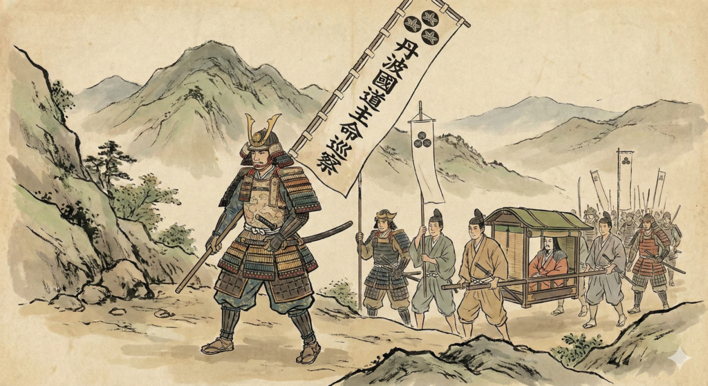 伝承によれば、丹波道主命がこの地を巡察した際、その先導役として軍旗を掲げた「旗手(旗指)」を務めた家臣がいました。 古代において「旗」は、単なる目印ではありません。それは神霊や天皇の霊威が宿る依代であり、それを掲げる者は神の先導者という祭祀的な役割も担っていました。