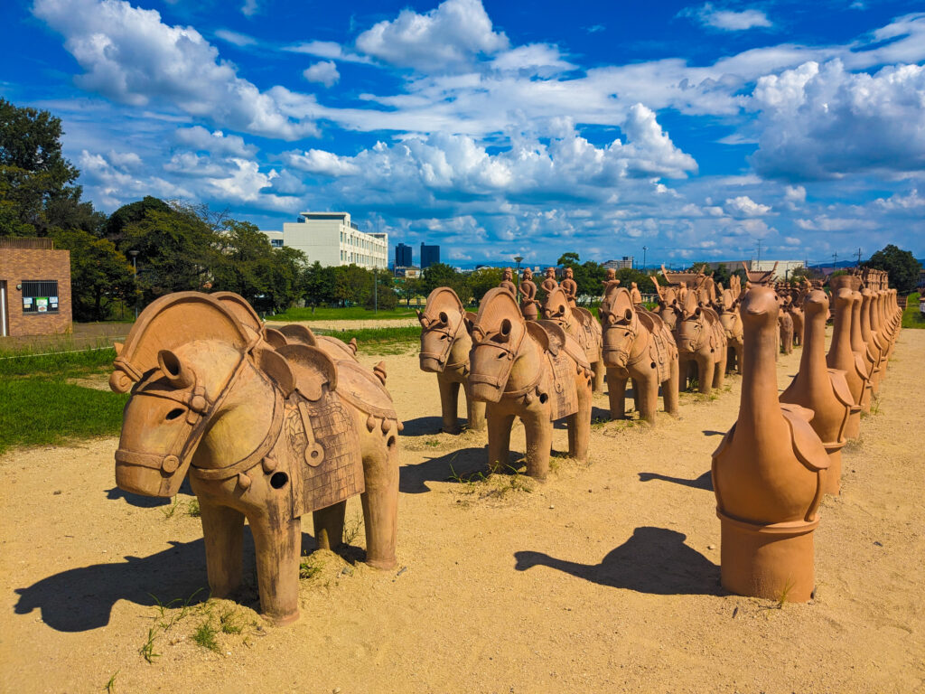 博物館で予習したら、いよいよ古墳へ。 内堤の埴輪祭祀場(レプリカ展示)で記念撮影をした後、ぜひ墳丘へ登ってください。後円部の頂上からは高槻の街並みが見渡せます。かつてはここから淀川の流れが見えたはずです。大王と同じ視点に立つ体験は、他では味わえません。