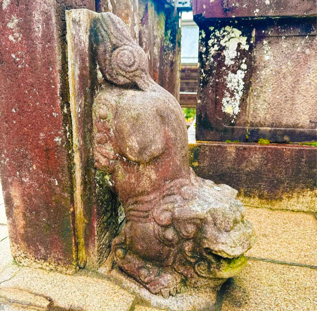これが有名な「逆さ狛犬」です。 「雲を蹴り上げて飛躍する」姿とされ、その頭を撫でると「金運」や「勝負運」が飛躍的に上がると伝えられています。 地を這うような姿勢から一気に跳ね上がるその姿は、一度は「逆賊」の汚名を着せられながらも、美濃総鎮守として復活した祭神・五十瓊敷入彦命の生き様(死に様)を象徴しているようにも見えます。