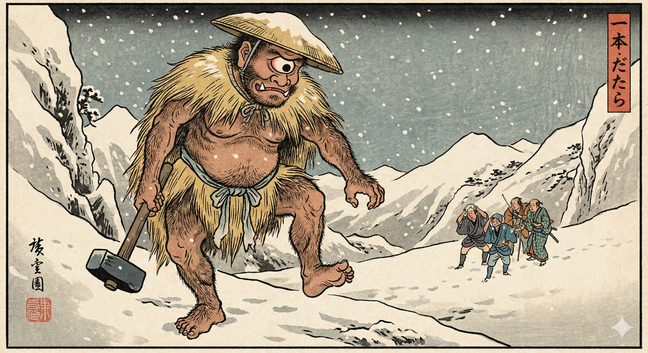 紀伊半島の背骨を成す果無(はてなし)山脈。人の気配も稀なその深山幽谷に、冬の訪れとともに現れる不思議な怪異があります。その名は「一本だたら」。 皿のように輝く一つ目と、強靭な一本足を持つこの妖怪は、和歌山と奈良の県境域において、古くから最も恐れられ、同時に親しまれてきた存在です。