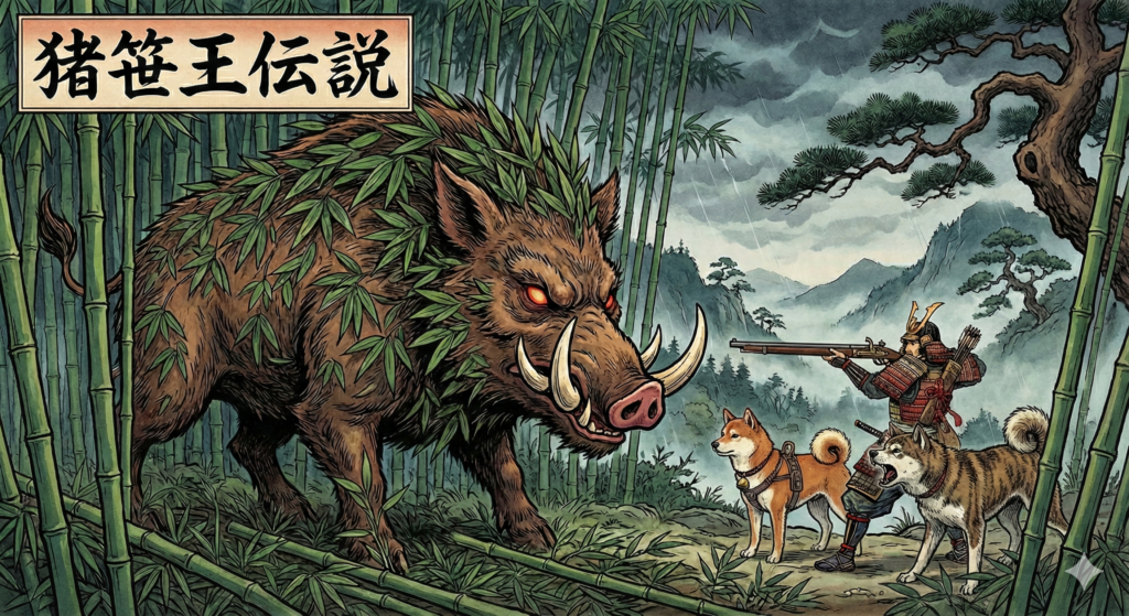 かつて伯母ヶ峰には、背中に笹が生い茂るほど巨大な老猪「猪笹王」が主(ぬし)として君臨していました。天ヶ瀬の鉄砲の名手、射場兵庫(いば・ひょうご)は、愛犬とともにこの魔性の猪に挑み、死闘の末にこれを撃ち取ります。