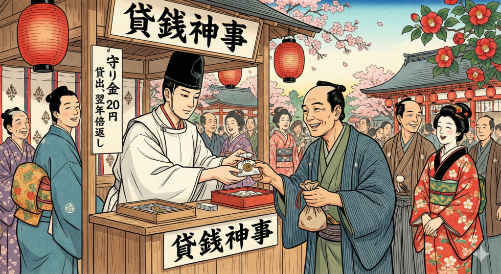 参拝者は神社から「守り金(20円)」を借ります。これを元手(種銭)として1年間励み、翌年に返済するのですが、そのルールが独特です。