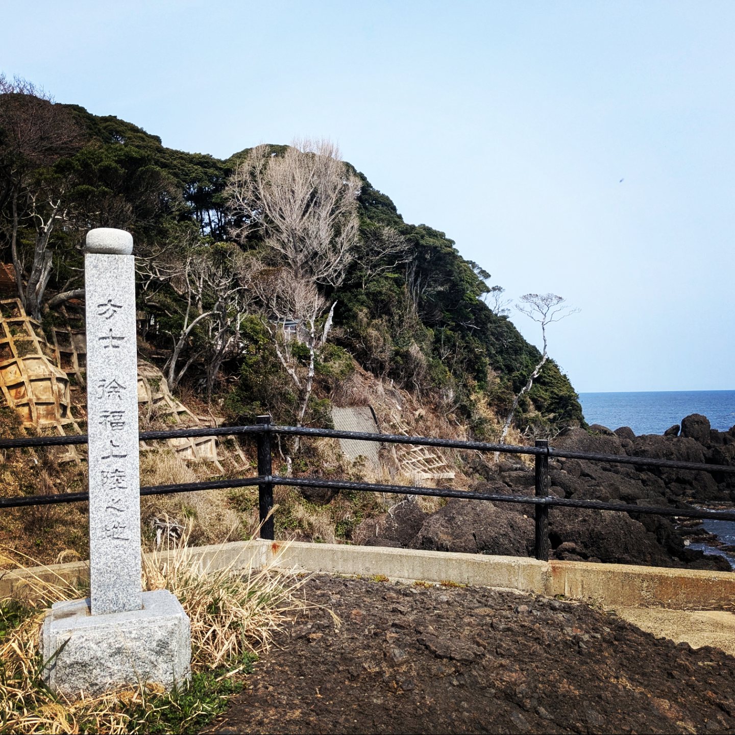 伝説によれば、徐福一行が上陸したのが、新井崎の海岸にある「ハコ岩」だとされています 。実際に訪れてみると、黒々とした岩がごつごつと連なる荒々しい海岸で、大船団が接岸するにはあまりに険しい場所です 。