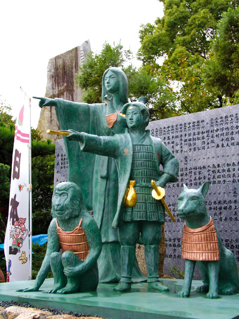 田村神社の境内には、百襲姫と、その弟である五十狭芹彦命(いさせりひこのみこと=吉備津彦命)の銅像が立っています。 吉備津彦命といえば、あの「桃太郎」のモデルとして有名ですが、この銅像の構図が非常に面白いのです。