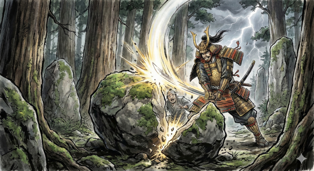 伝承によれば、丹波道主命がこの地を訪れた際、ある家臣が「良い土地はない」と嘘をつきました。後にそれが私欲による虚偽だと発覚し、激怒した命が家臣を追いかけました。家臣が巨岩の陰に隠れたところ、命は「国見の剣」を振り下ろし、岩ごと家臣を斬ろうとした——その時の傷跡が、この岩に残っていると言われています。
