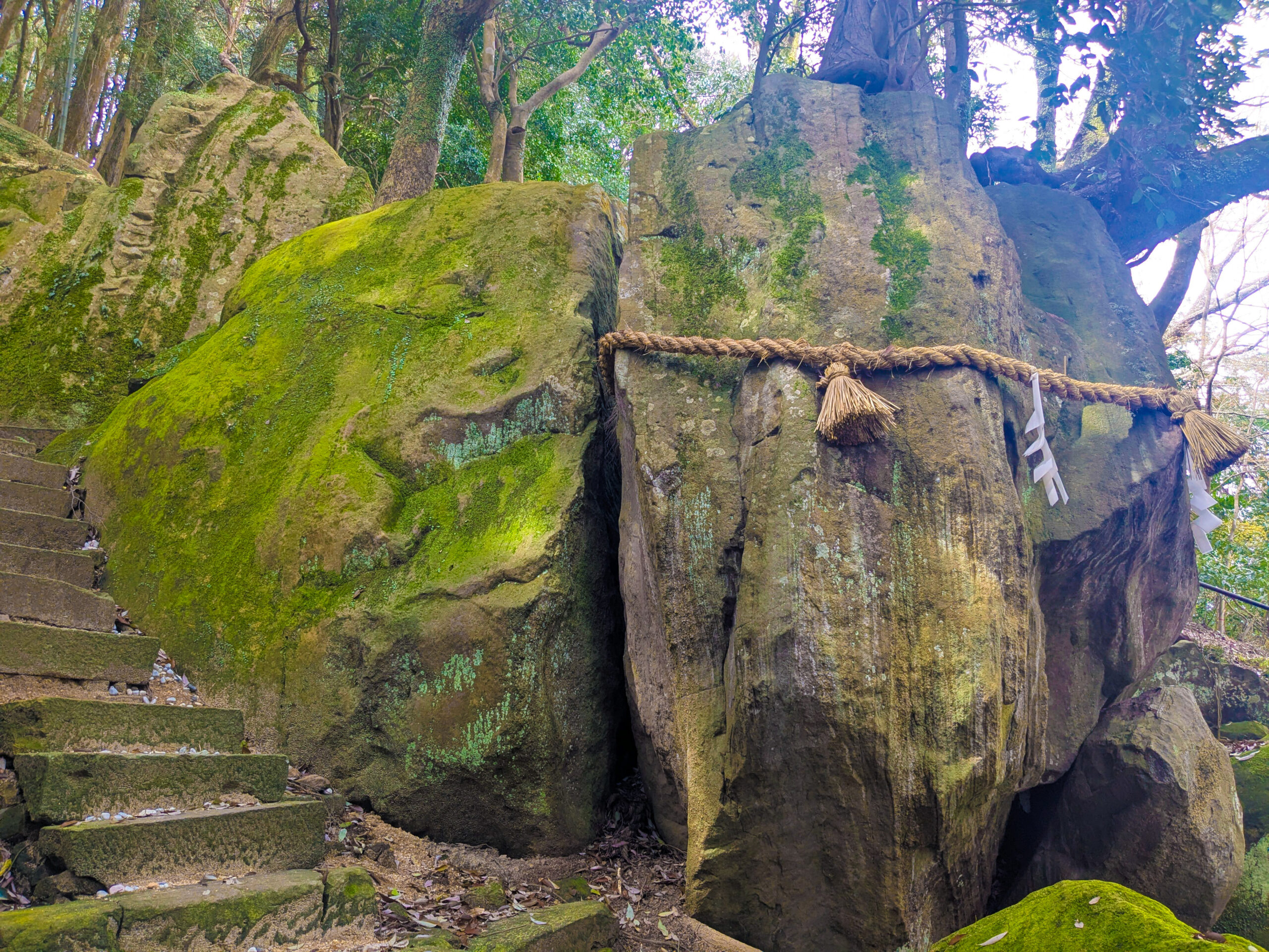 最後に、少し不思議な伝説をご紹介しましょう。参道脇にある真っ二つに割れた巨石、通称「剣岩」です。