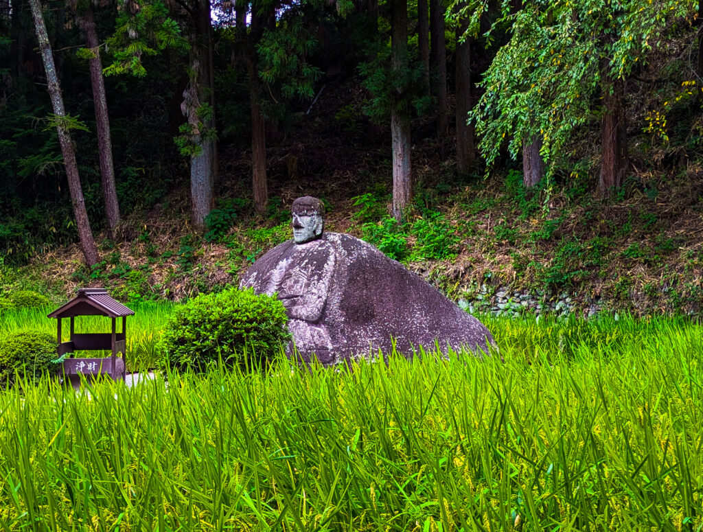 諏訪大社下社春宮のほど近く、のどかな風景の中に、その石仏はどっしりと鎮座しています 。巨大な自然石の胴体に、ちょこんと乗ったアンバランスな頭 。その表情は厳かでありながら、どこかユーモラスで愛嬌があり、見る人の心を和ませてくれます 。