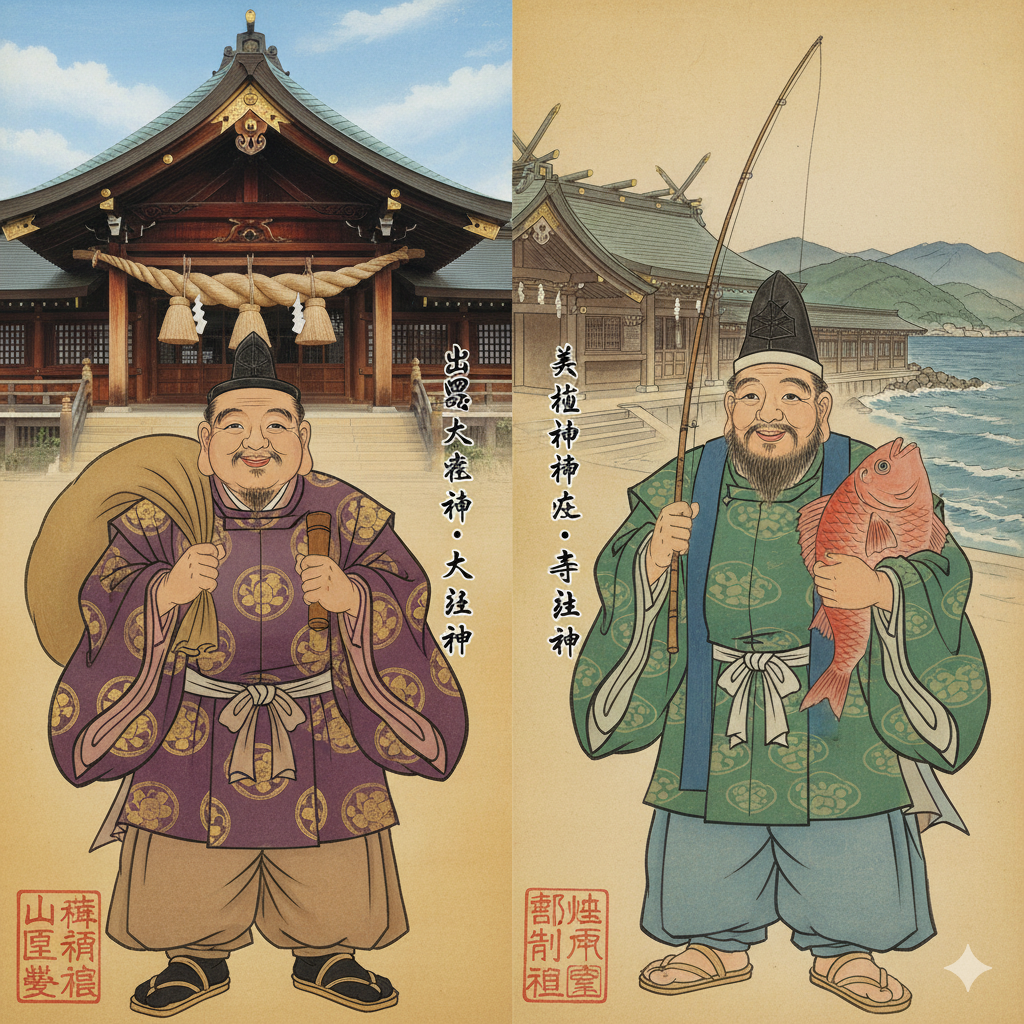 美保神社を語る上で欠かせないのが、出雲大社との関係です。出雲大社の御祭神・大国主神(だいこく様)と、美保神社の御祭神・事代主神(えびす様)は、父と子の関係にあります 。