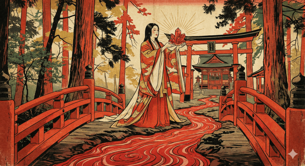 まず注目したいのが、主祭神である丹生都比売大神(にうつひめのおおかみ)です。 天照大御神の妹神とも伝わるこの女神の名の「丹」は、朱砂(しんしゃ)、すなわち水銀の原料となる赤い鉱石を指します。
