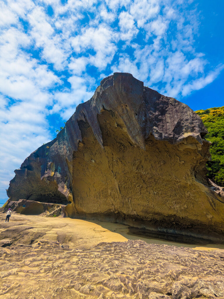• 千畳敷(せんじょうじき) 遊歩道の入り口にある巨大な海食洞。ここが多娥丸の「アジト」であり、彼が最期を迎えた場所とされます。頭上を覆う岩盤の圧迫感は、まさに鬼の棲み家。ここから海を眺め、彼が見ていた景色を想像してみてください。