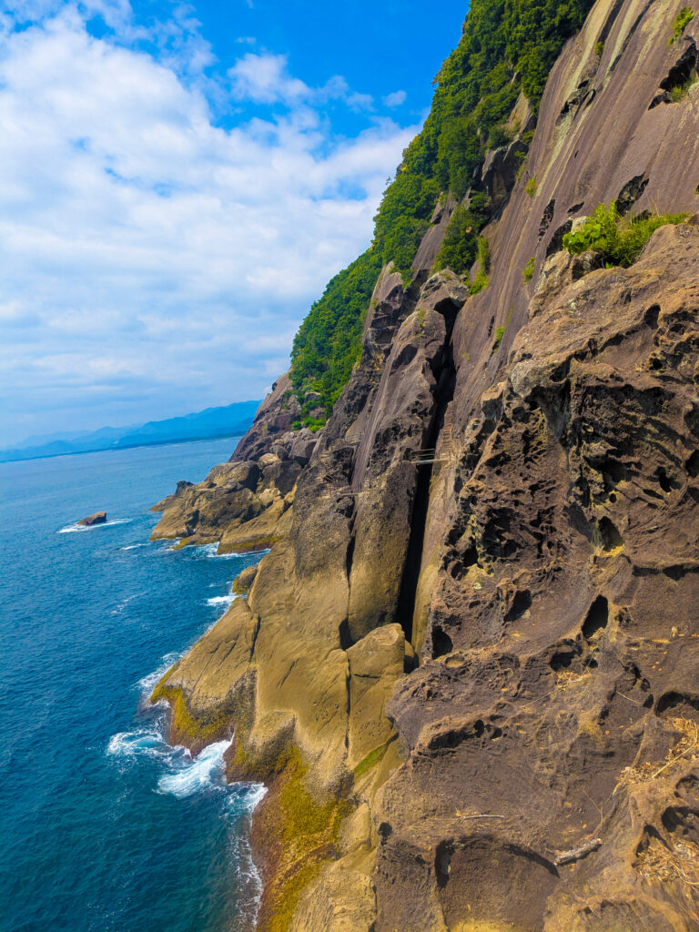 1km以上にわたって続く凝灰岩の大岩壁。無数の洞窟と奇岩は、まるで地球そのものが荒波に削り出された彫刻のようです。しかし、この場所が「鬼ヶ城」と呼ばれる理由は、単にその見た目が恐ろしいからだけではありません。