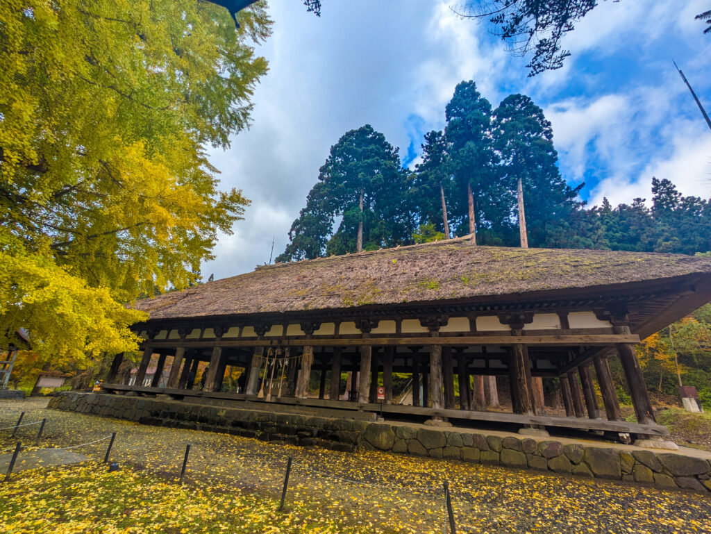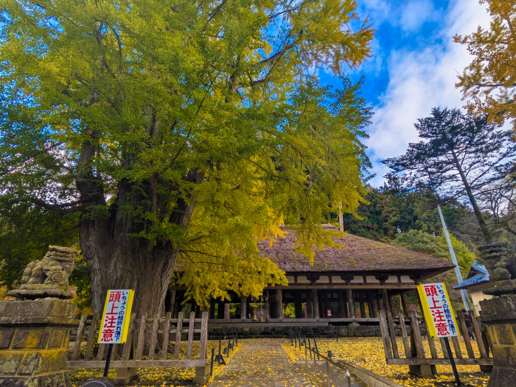 長床の前に立つ、高さ30m、樹齢800年と言われる大イチョウ。別名「逆さイチョウ」とも呼ばれます。 秋の落葉シーズンには、地面一面が黄色い葉で埋め尽くされ、まるで「黄金の絨毯」を敷き詰めたような絶景が出現します。茅葺屋根の古色蒼然とした茶色と、イチョウの鮮烈な黄色のコントラストは、一生に一度は見ておきたい美しさです。