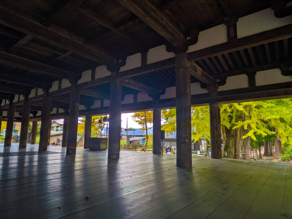 実は、現在の長床は創建当初のままではありません。1611年(慶長16年)、会津地方を襲った巨大地震(慶長会津地震)により、新宮熊野神社の建物の多くが倒壊しました。 しかし、長床だけは倒壊した部材を再利用し、慶長19年(1614年)に当時の会津領主・蒲生氏によって再建されました。この時、平安時代の様式を忠実に守って再建されたおかげで、私たちは今も1000年前の建築空間を追体験できるのです。