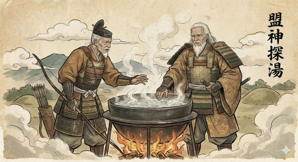彼の忠誠を象徴する劇的なエピソードが「盟神探湯(くかたち)」です 。