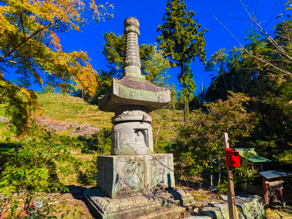 皷神社の見どころは神話だけではありません。 本殿の左奥にひっそりと佇む「石造宝塔(国指定重要文化財)」は、美術史的にも極めて価値の高い傑作です。