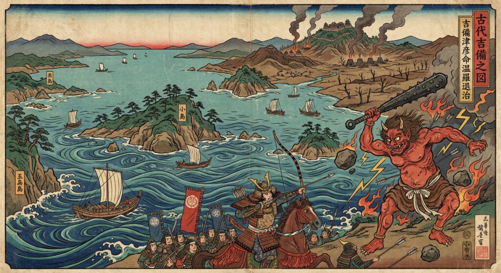 伝説では「鬼」とされる温羅ですが、吉備津宮縁起によると、第10代崇神天皇の時代に百済から渡来した王子とされています。「眼が大きく、髪が赤い」という異形の姿は、タタラ製鉄の炎や赤錆を扱う製鉄集団の長であるという説が有力です。