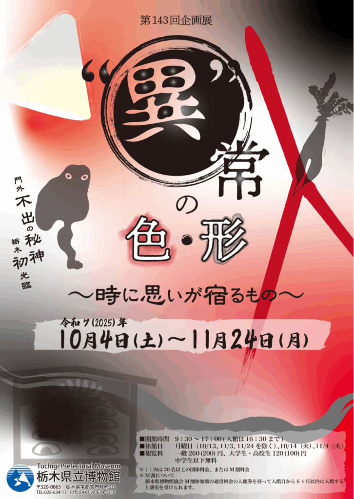 令和7(2025)年10月4日(土)~令和7(2025)年11月24日(月)に栃木県立博物館にて開催されている企画展『“異”常の色・形~時に思いが宿るもの~』にて夔神の神像が展示されています。御開帳の時よりも間近で見ることができるチャンスですので訪れてみてはいかがでしょうか。