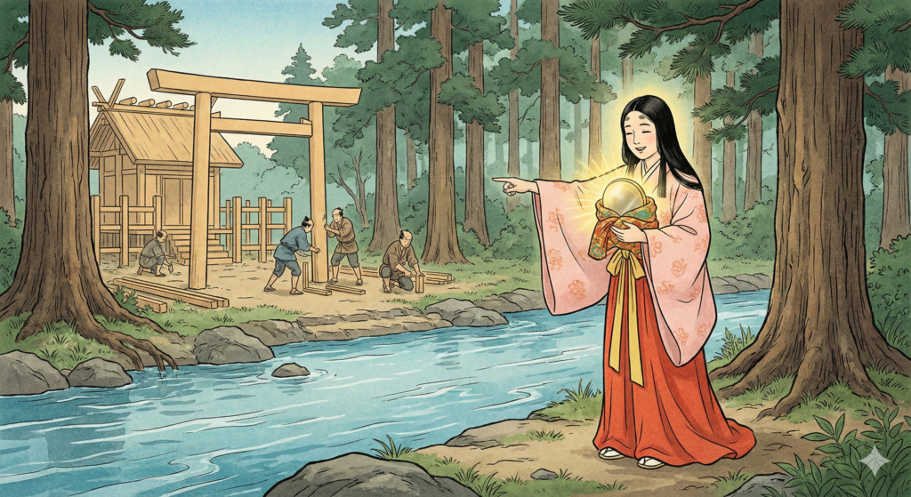 数十年の旅の末、倭姫命はついに伊勢国に入り、五十鈴川のほとりに辿り着きます。ここで天照大御神は、歴史に残る有名な神託を下しました。