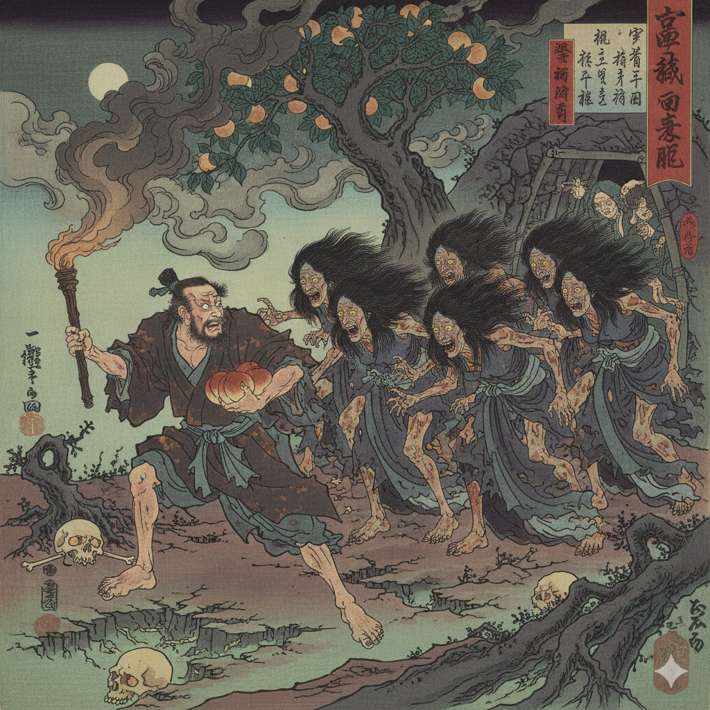 恐怖に駆られたイザナギは、一目散に逃げ出します 。辱めを受けたと激怒したイザナミは、黄泉醜女(よもつしこめ)と呼ばれる鬼女を追手として差し向けました 。