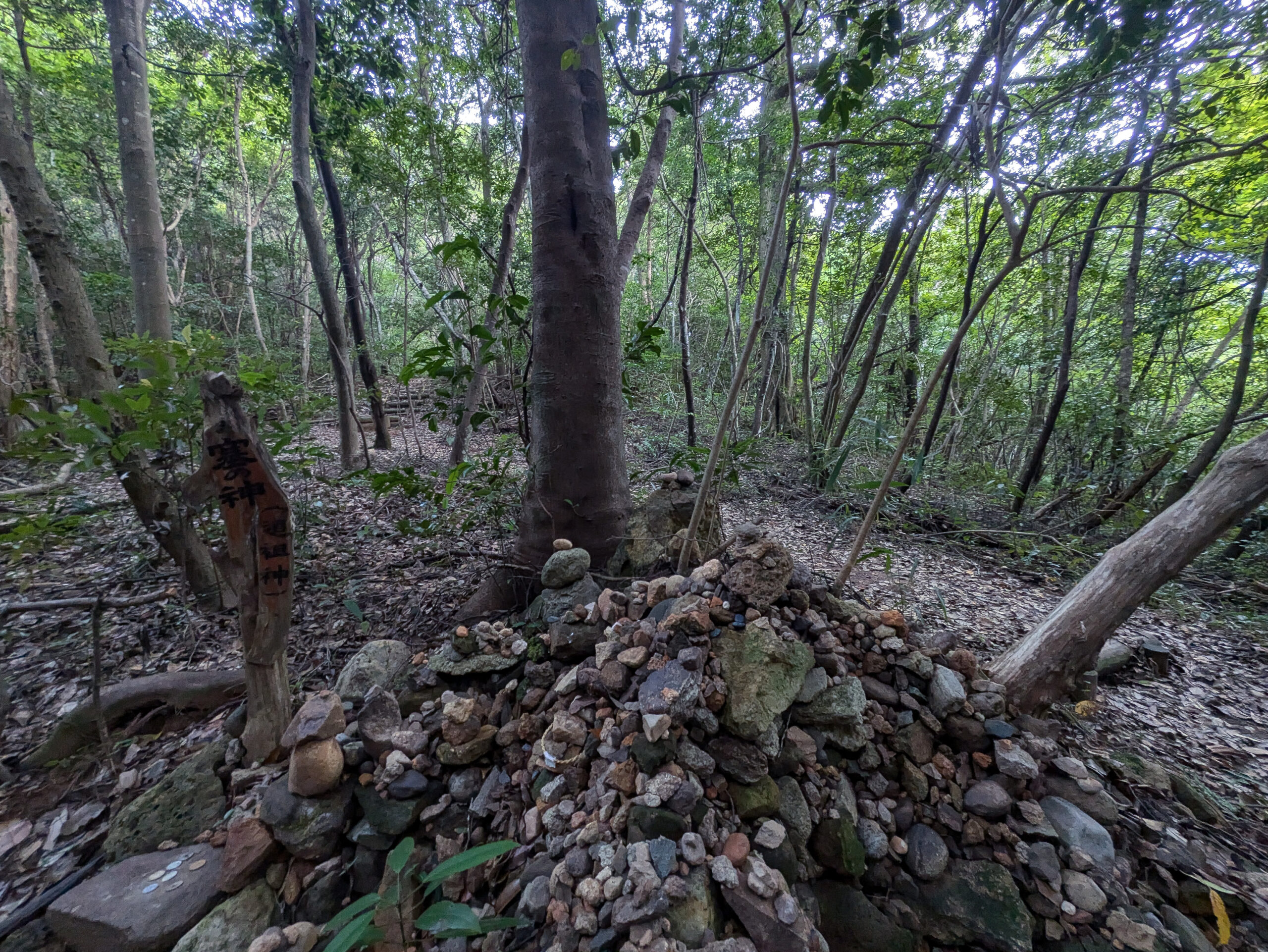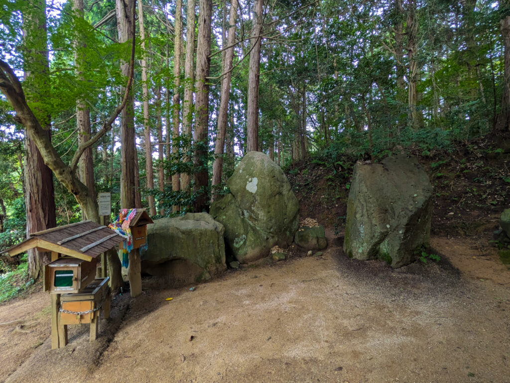 さらに奥へ進むと、神話の「千引の岩」を彷彿とさせる、苔むした複数の巨石が鎮座しています 。これらの岩が、イザナギが生と死の世界を分かつために置いたとされる封印の石です。岩の向こう側は特別な洞窟などではなく、静かな林が広がっているだけですが、ここがまさしく「境界」なのだと感じさせる、厳かで神秘的な雰囲気に満ちています 。